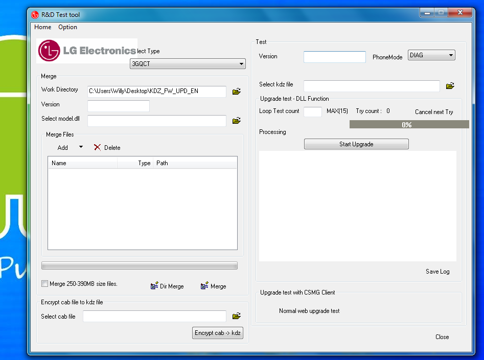 - Nos aparecerá el R&D Test tool aqui tenemos que buscar nuestro nuestro firmware KDZ y seleccionar Normal web upgrade test