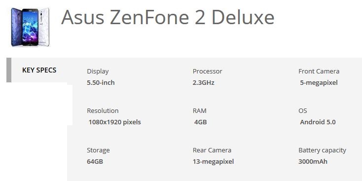 To recap, the Asus ZenFone 2 Deluxe comes with 4GB of RAM, a 2.3GHz quad-core Intel Atom Z3580 SoC, 13-megapixel rear camera, a 5-megapixel front camera, and a 3000mAh battery. It sports a 5.50-inch full-HD display with 72 percent screen-to-body ration. It's a dual-SIM, dual-standby 4G/ LTE smartphone that runs Android 5.0 Lollipop.