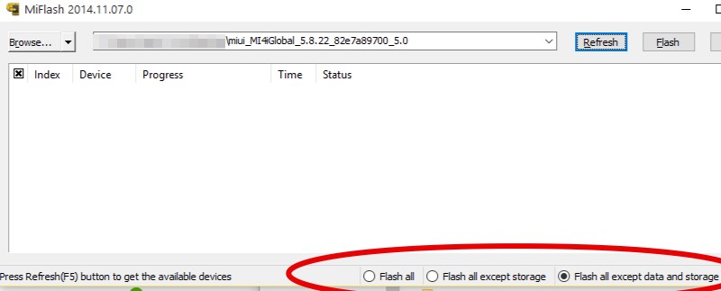 6) There are three options you can choose from at the bottom: Flash all will flash all the files, and wipe all userdata and all files in internal storage. Flash all except storage will flash updated files, wipe user data, but will not delete files in internal storage. Flash all except data and storage will only flash the updated files, and will not wipe user data and files in internal storage. To preserve your user data make sure you select Flash all except data and storage.