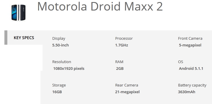 The successor to last year's Droid Maxx, the Motorola Droid Maxx 2 sports a 5.5-inch display. It is powered by a Qualcomm Snapdragon 615 octa-core SoC clocked at 1.7GHz and Adreno 405 GPU, paired with 2GB of RAM, and comes with 16GB of internal storage which can be expanded up to 128GB using a microSD card.