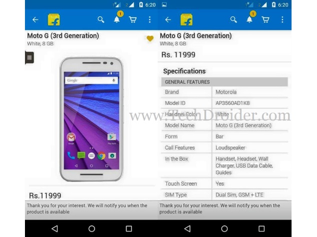 In line with recent rumours, the Flipkart listing suggested that the Motorola Moto G (Gen 3) will be available in two variants - 8GB inbuilt storage with 1GB of RAM, and a 16GB storage with 2GB of RAM. According to the Flipkart listing (now pulled down), the Moto G (Gen 3) will be available at Rs. 11,999 for the 8GB variant.