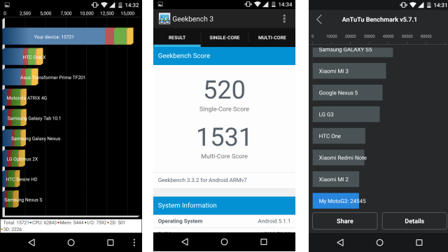 Motorola has bumped up the battery capacity of the third gen Moto G from 2070mAh on the second gen to 2470mAh on the third gen. We could easily get close to a day’s worth of usage on regular tasks such as calling, messaging, updating social media and watching a couple of videos. The PC Mark for Android test gives around 10 hours 7 minutes of on-screen time. Apart from the Android battery saver mode, there isn’t a proprietary battery saver mode on the Moto G.
